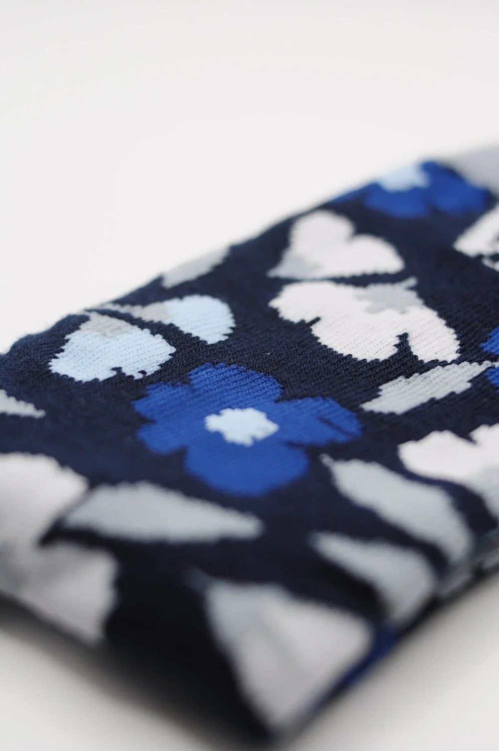 Navy blue and lavender floral socks with a beautiful, dark floral pattern in shades of blue and gray. Delicate, stylized flowers in varying blue tones are scattered across the fabric, accented by soft touches of lavender.