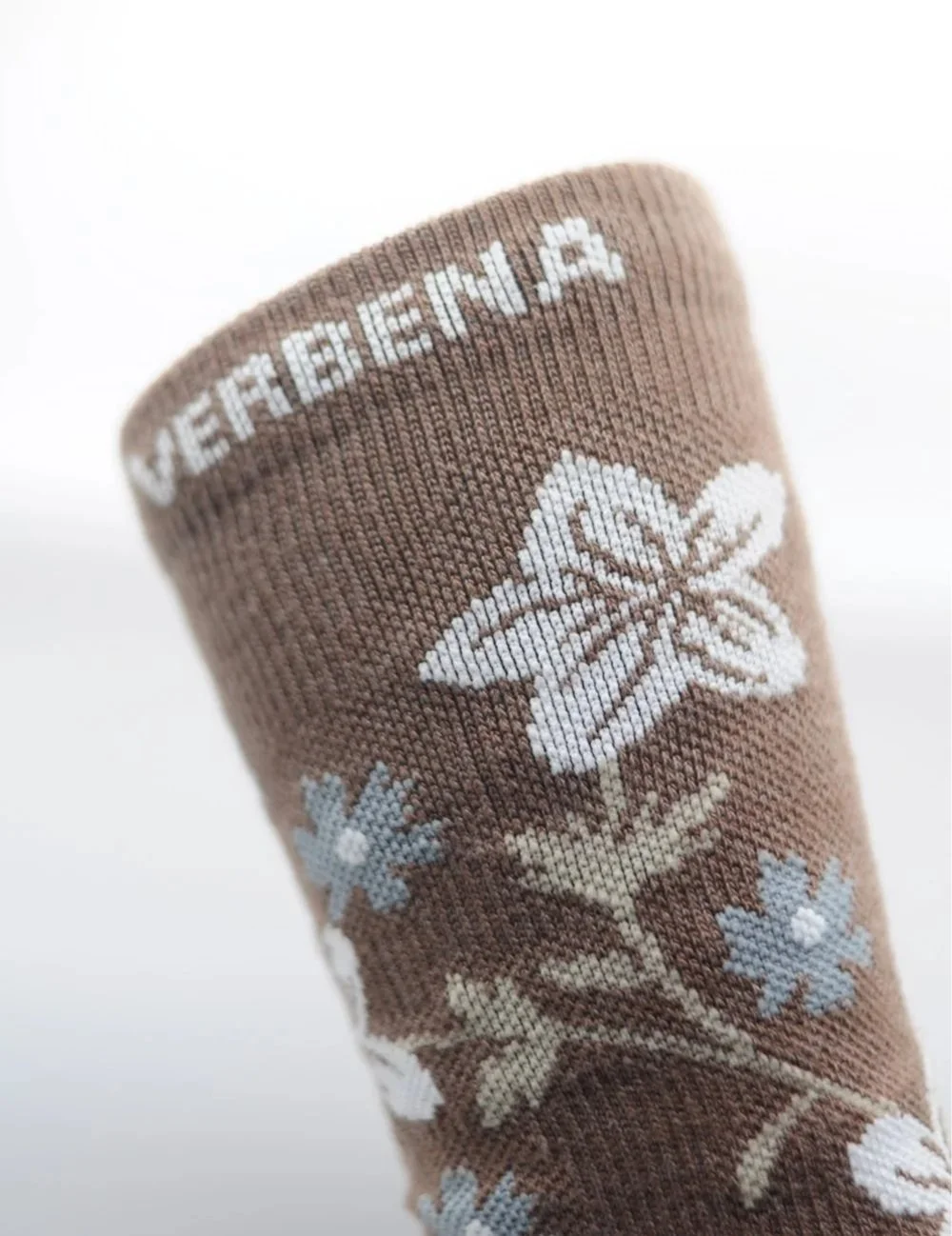Purple floral socks in shades of purple and gray. Delicate, flowers in varying violet and blue tones are scattered across the fabric, with gray accents. The violet and gray palette creates a fresh and serene aesthetic.